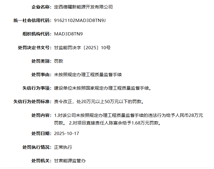 近日,国家能源局资质和信用信息系统披露处罚信息显示,定西德曜新能源开发有限公司因未按照规定 办理工程质量监督手续,被甘肃能源监管办罚款28万元。同时,对项目直接责任人陈富余给予1.68万元 罚款。 天眼查显示,定西德曜新能源开发有限公司成立于2023年,位于甘肃省定西市。该公司是一家以从事电 力、热力生产和供应业为主的企业,企业注册资本10000万人民币。 ...