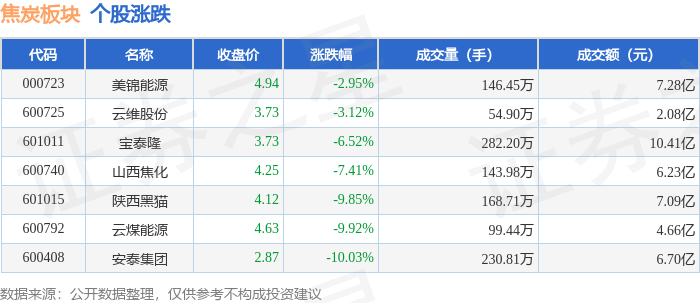 板块整体表现 - 焦炭板块在10月23日较上一交易日大幅上涨6.18%,显著跑赢大盘指数[1] - 当日上证指数上涨0.22%至3922.41点,深证成指上涨0.22%至13025.45点[1] - 板块内多数个股表现强劲,其中四只个股涨停,涨幅均超过10%[1]   领涨个股表现 - 陕西黑猫领涨板块,收盘价为4.57元,单日涨幅达10.12%,成交量为85.46万手,成交额为3.82亿元[1] - 山西焦化涨幅为10.07%,收盘价4.59元,成交量为174.28万手,成交额为7.79亿元[1] - 云煤能源涨幅为10.06%,收盘价5.14元,成交量为62.04万手,成交额为3.07亿元[1] - 安泰集团涨停,涨幅为10.00%,收盘价3.19元,成交量为209.76万手,成交额为6.40亿元[1]   板块资金流向 - 焦炭板块整体获得主力资金净流入5.74亿元,但游资资金净流出2.62亿元,散户资金净流出3.12亿元[1] - 山西焦化获得主力资金净流入1.73亿元,主力净占比达22.28%[2] - 陕西黑猫获得主力资金净流入1.60亿元,主力净占比高达41.84%[2] - 安泰集团获得主力资金净流入1.29亿元,主力净占比为20.12%[2]