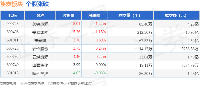 市场整体表现 - 2023年12月5日,焦炭板块整体表现疲软,较上一交易日下跌1.8% [1] - 同日,上证指数上涨0.7%至3902.81点,深证成指上涨1.08%至13147.68点,市场整体上涨而焦炭板块逆市下跌 [1] - 板块内个股多数下跌,陕西黑猫以-0.98%的跌幅领跌板块 [1] 个股价格与交易表现 - 美锦能源收盘价为5.01元,上涨1.42%,成交85.40万手,成交额4.25亿元 [1] - 安泰集团收盘价为5.26元,上涨1.15%,成交212.50万手,成交额10.93亿元 [1] - 宝泰隆收盘价为3.76元,上涨0.80%,成交67.52万手,成交额2.52亿元 [1] - 云维股份收盘价为3.75元,上涨0.27%,成交14.12万手,成交额5253.58万元 [1] - 云煤能源收盘价为4.46元,上涨0.22%,成交33.64万手,成交额1.49亿元 [1] - 山西焦化收盘价为3.99元,涨跌幅为0.00%,成交19.11万手,成交额7574.79万元 [1] - 陕西黑猫收盘价为4.05元,下跌0.98%,成交36.30万手,成交额1.46亿元 [1] 板块资金流向 - 当日焦炭板块整体呈现主力资金和游资净流出,散户资金净流入的格局 [1] - 板块主力资金净流出2400.03万元,游资资金净流出1870.75万元,散户资金净流入4270.78万元 [1] 个股资金流向明细 - 美锦能源主力资金净流出1535.95万元,净占比-3.61%,游资净流出93.22万元,散户净流出1442.72万元 [2] - 云维股份主力资金净流出264.66万元,净占比-5.04%,游资净流入302.95万元,散户净流出38.29万元 [2] - 山西焦化主力资金净流出483.19万元,净占比-6.38%,游资净流出3.28万元,散户净流入486.47万元 [2] - 宝泰隆主力资金净流出576.01万元,净占比-2.29%,游资净流入466.03万元,散户净流入109.98万元 [2] - 安泰集团主力资金净流出658.74万元,净占比-0.60%,游资净流出1462.21万元,散户净流入2120.95万元 [2] - 云煤能源主力资金净流出740.60万元,净占比-4.96%,游资净流出633.38万元,散户净流入1373.98万元 [2] - 陕西黑猫主力资金净流出1212.78万元,净占比-8.29%,游资净流出447.65万元,散户净流入1660.43万元 [2]