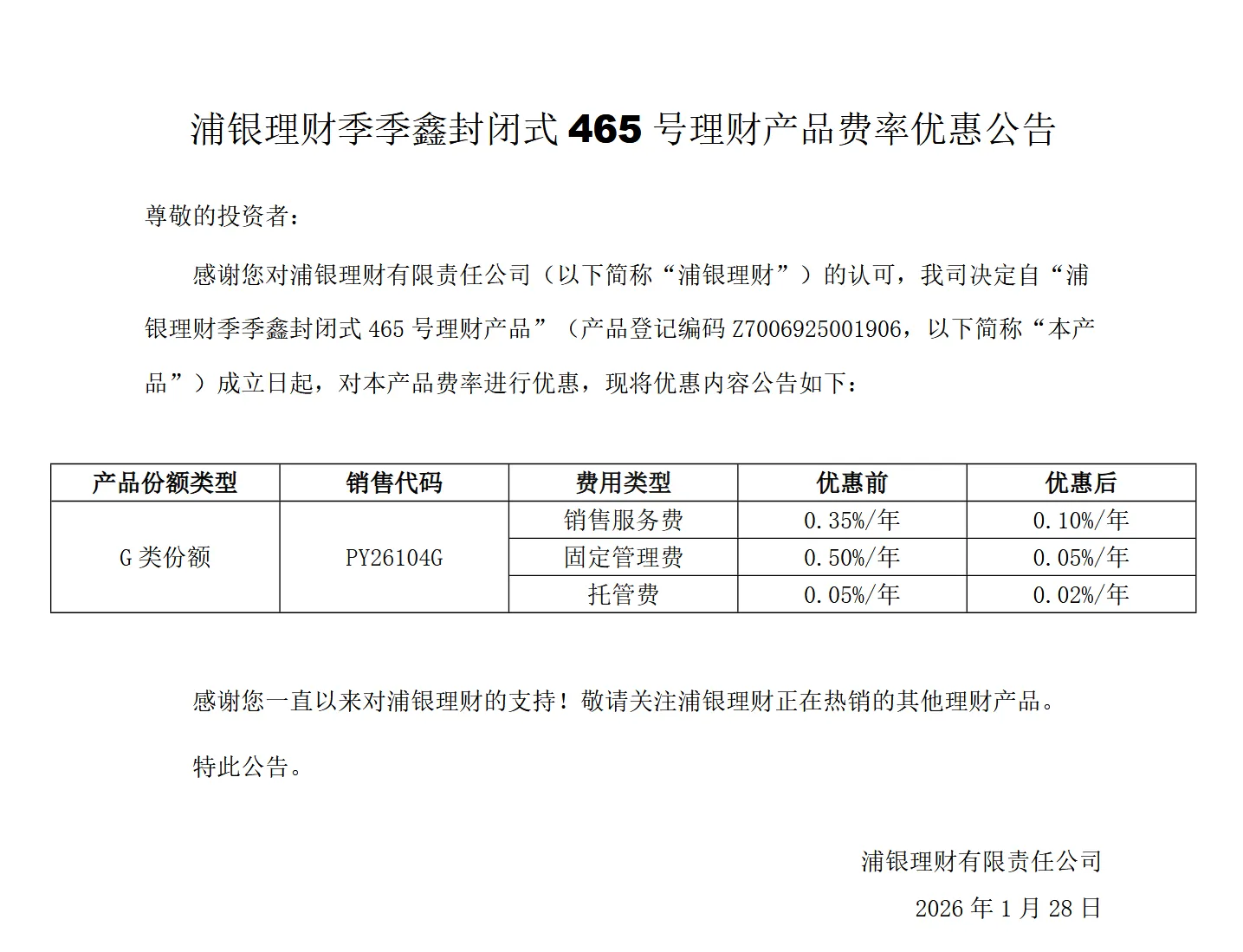 浦银理财:对季季鑫封闭式465号理财产品费率进行优惠