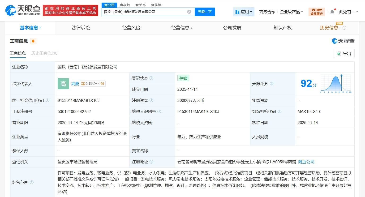 | 都在用的商业商可工具 | 章公司 | 查老板 直关系 查风险 | | | | | --- | --- | --- | --- | --- | --- | | | 国家中小企业发展子基金旗下机构 | 国投(云南)新能源发展有限公司 | 8 天眼一下 | | | | 基本信息 7 | 法律诉讼 | 经营风险 | 经营信息 4 | 公司发展 | | | 工商信息 ● | | | | | | | 工商信息 历史工商信息0 | | | | | | | 企业名称 | 国投(云南)新能源发展有限公司 | | | | | | 法定代表人 | 覧 高鹏 凝关联企业 99 | 6 松井田流 | 存续 | | 天郎 | | | | 成立日期 | 2025-11-14 | | | | 统一社会信用代码 2 | 91530114MAK19TX10J | 注册资本 2 | 20000万人民币 | | दे सि | | 工商注册号 | 530121000442752 | 纳税人识别号 2 | 91530114MAK19TX10J | | REAL | | 营业期限 | 2025-11-14 至 无固定期限 | 纳税人资质 | | | ...