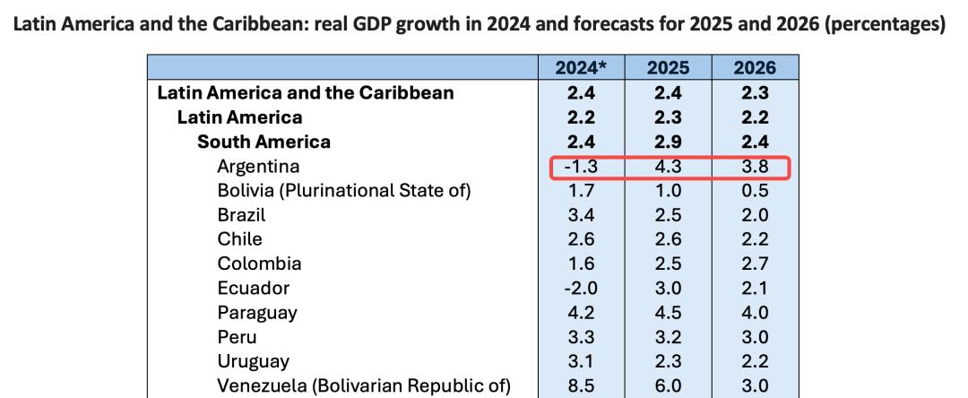 说起阿根廷,这个拉美国家最鲜明的注脚,莫过于居高不下的通胀和一泻千里的汇率。 过去数年,阿根廷持续处于货币崩溃、通胀飙升、中央银行近乎破产的经济状态中。2023年底,阿根廷年通胀率超200%、有着近2771亿美元的巨额外债 以及外贸和财政的双赤字。 而如今,这一印象亟待被刷新。 2023年12月10日,主张经济自由放任主义的Javier Milei(米莱)正式宣誓就任阿根廷总统府,成为阿根廷新任总统,其主张大幅削减政府部门开支、大幅 贬值本币比索、推进经济自由化与私营市场主导,一系列经济改革政策为陷于经济泥沼多年的阿根廷带来希望。 2025年已经过去的前两个季度,阿根廷GDP同比增长分别是5.8%和6.3%。而就在去年,这一数字还是负值。 Economic Commission for Latin America and the Caribbean (CEPAL) 的2025年报告展望中,阿根廷在南美国家中被列为增长最快,其 2025年GDP增速预测为 约4.3%。并且,在未来1–2年的区域增长预期中,阿根廷被广泛视作西半球表现最亮眼的经济体。 | | 2024* | 2025 | 2026 | | --- ...