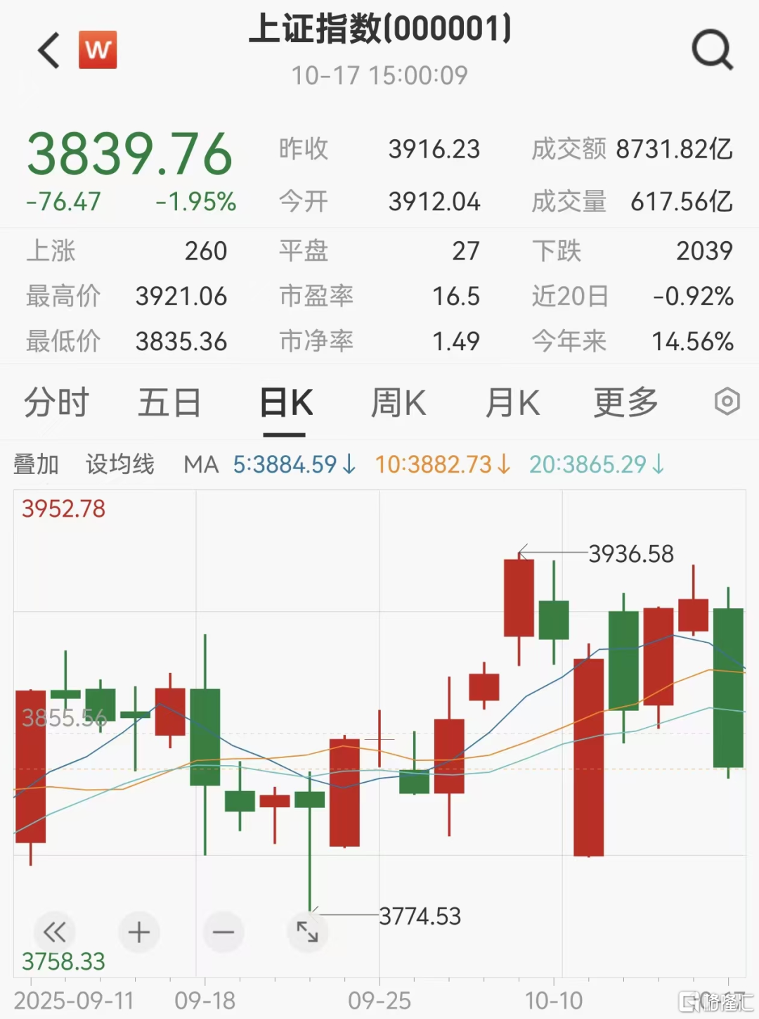 周五,以为调整差不多了,准备梭哈→Duang!!!收一根扎扎实实的大阴线。 我个老天爷,这周5个交易日,到底有谁能猜得中节奏?简直魔鬼步伐,步步惊心。。。 周一,以为崩盘,开盘割肉→低开高走,收一根大阳线; 周二,以为转强,开盘梭哈→冲高回落跳水,收一根中阴线; 周三,以为会下跌,再次割肉→低开高走,收一根中阳线; 周四,以为大盘趁热打铁上涨,加仓→高开低走,收一根带有上影线的小阳线(上证指数涨0.1%。。。); | 3839.76 昨收 3916.23 成交额 8731.82亿 -76.47 -1.95% | | --- | | 上涨 | | 最高价 3921.06 市盈率 16.5 近20日 -0.92% | | 最低价 3835.36 市净率 | 兄弟们,除了嘎嘎嘎,有什么体面一点的加仓方式,在评论区知会一声啊。 1 以为、以为、以为,都是我一个人的一厢情愿! A股连续两日跌破2万亿成交额 债涨、黄金涨、股市下跌,市场又进入避险模式了。 周五三大指数全线下挫,上证指数跌1.95%,深证成指跌3.04%,创业板指跌3.36%,后两者均跌破30日线支撑,成交量下降明显,周一周二还有2.4万亿左 右,周四、周 ...