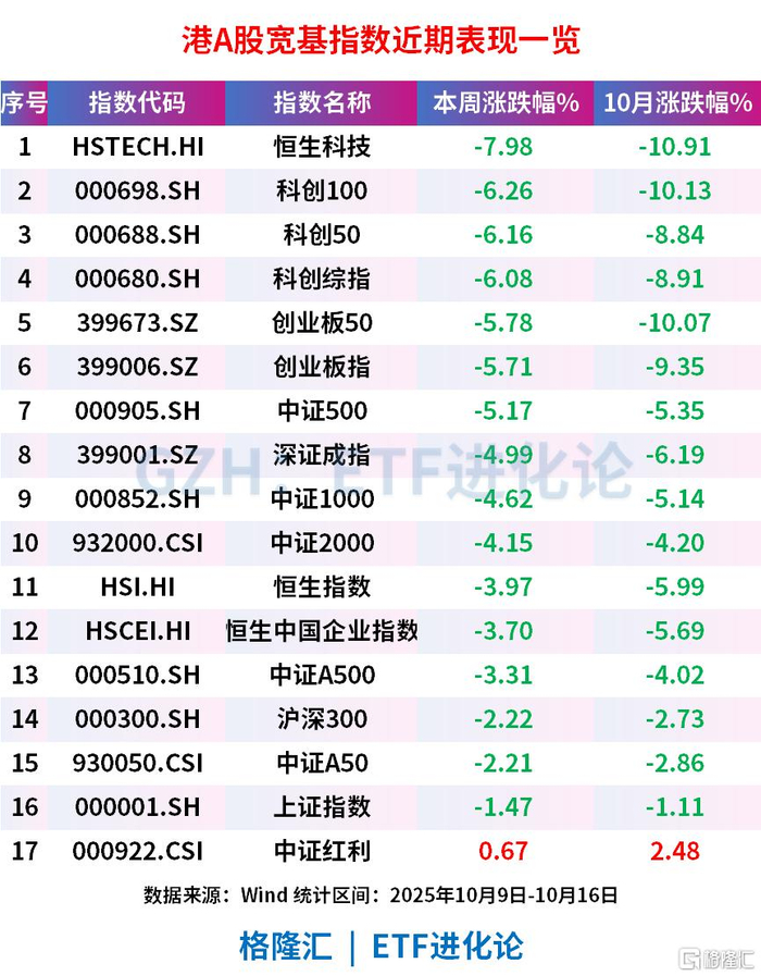 周五三大指数全线下挫,上证指数跌1.95%,深证成指跌3.04%,创业板指跌3.36%,后两者均跌破30日 线支撑,成交量下降明显,周一周二还有2.4万亿左右,周四、周五直接跌破2万亿。 港股方面,恒指收跌2.48%,恒生科技指数跌4.05%,均创一个月新低。科技股全线走弱,中兴通讯跌 近13%,中芯国际、华虹半导体双双跌超6%。 全周表现来看,除了中证红利指数微涨0.67%,港A股宽基指数尽数飘绿,恒生科技指数本周跌近8%, 科创100、科创50和科创综指均跌逾6%,创业板指跌5.7%。 | 序号 | 指数代码 | 指数名称 | | 本周涨跌幅% 10月涨跌幅% | | --- | --- | --- | --- | --- | | 1 | HSTECH.HI | 恒生科技 | -7.98 | -10.91 | | 2 | 000698.SH | 科创100 | -6.26 | -10.13 | | 3 | 000688.SH | 科创20 | -6.16 | -8.84 | | 4 | 000680.SH | 科创综指 | -6.08 | -8.91 | | 5 | 399673.SZ | 创业板50 | ...