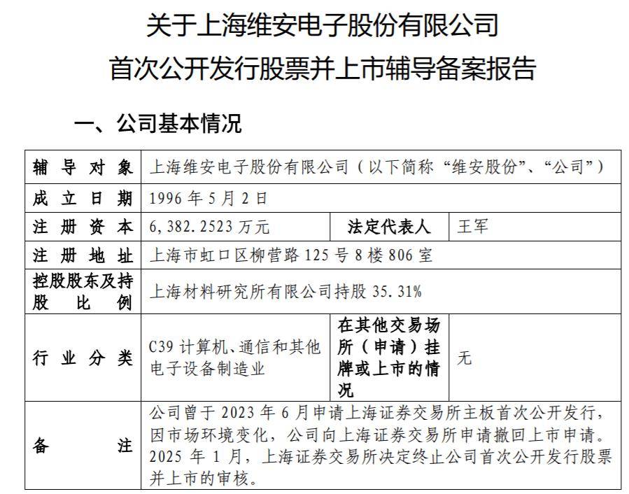 公司基本情况 - 公司全称为上海维安电子股份有限公司,成立于1996年5月2日,注册资本为6,382.2523万元,法定代表人为王军 [1] - 公司注册地址位于上海市虹口区柳营路125号8楼806室 [1] - 公司所属行业为计算机、通信和其他电子设备制造业 [1] - 公司是一家专注于电路保护与功率控制的综合解决方案提供商,主要从事电子元件、功率半导体分立器件与模拟集成电路的研发、生产和销售 [2] 上市进程与历史 - 公司曾于2023年6月申请上海证券交易所主板首次公开发行,后因市场环境变化主动撤回申请 [1] - 2025年1月,上海证券交易所决定终止对公司首次公开发行股票并上市的审核 [1] - 2024年12月9日,公司于上海证监局重新启动IPO辅导备案,辅导机构为中信证券 [1] 股权结构与控制权 - 公司控股股东为上海材料研究所有限公司,直接持股比例为35.31% [1][4] - 控股股东通过与一致行动人签署协议,合计控制公司59.80%股份的表决权 [4] - 上海科学院持有控股股东100%股权,为公司实际控制人 [4] - 2024年7月,公司主要成员发生变更,秦曦、杨清退出,新增陈顺华、张君睿分别担任董事和监事 [4] 财务与经营业绩 - 2020年至2022年,公司营业收入持续增长,分别为7.84亿元、11.53亿元和11.88亿元 [3] - 同期,公司净利润分别为0.79亿元、1.26亿元及1.27亿元,呈现增长趋势 [3] - 2022年末,公司资产总额为9.88亿元,归属于母公司所有者权益为7.14亿元 [3] - 2022年,公司资产负债率(母公司)为24.58%,较前两年有所下降 [3] - 2022年,公司经营活动产生的现金流量净额大幅改善,达到1.28亿元,而2021年仅为0.17亿元 [3] - 公司研发投入占营业收入的比例逐年提升,从2020年的7.75%增至2022年的8.96% [3] - 2022年,公司基本每股收益和稀释每股收益均为1.99元,加权平均净资产收益率为19.14% [3] - 公司现金分红金额逐年增加,2020年为0元,2021年为0.37亿元,2022年为0.41亿元 [3]
