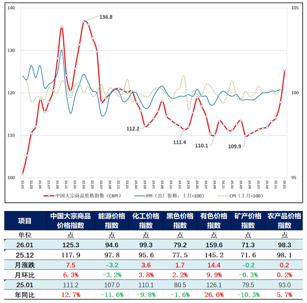 中国大宗商品价格指数 (CBPI) 2026年1月数据解读 - 2026年1月中国大宗商品价格指数(CBPI)为125.3点,环比上涨6.3%,同比上涨12.7%,创2022年7月以来新高 [1] - 指数上涨主要受“两重”“两新”政策加力扩围、“反内卷”政策深化、企业乐观预期及生产活动扩张支撑,为“十五五”开局奠定基础 [1] - 国际地缘政治演变、货币政策宽松预期及大宗商品期货价格剧烈波动,带动国内有色、化工等价格快速上涨,但也带来挑战 [1] 分行业价格指数表现 - **有色价格指数**:报159.6点,月环比大幅上涨9.9%,年同比大幅上涨26.6% [3] - **化工价格指数**:报99.3点,月环比快速上涨3.8%,但年同比下跌9.8% [3] - **黑色价格指数**:报79.2点,月环比继续回升2.2%,年同比微跌1.6% [3] - **农产品价格指数**:报98.3点,月环比小幅走高0.2%,年同比上涨5.7% [3] - **矿产价格指数**:报71.3点,月环比小幅回落0.3%,年同比下跌10.3% [3] - **能源价格指数**:报94.6点,月环比弱势下行3.2%,年同比下跌11.6% [3] 重点监测商品价格涨跌概况 - 在重点监测的50种大宗商品中,1月份有33种(66%)价格上涨,17种(34%)价格下跌 [4] - **涨幅前三商品**:碳酸锂(月环比涨48.4%)、精炼锡(月环比涨20.2%)、精炼镍(月环比涨19.5%) [4] - **跌幅前三商品**:瓦楞纸(月环比跌13.1%)、烧碱(月环比跌7%)、焦炭(月环比跌6.9%) [4] 细分商品价格变动详情 - **能源类**:柴油价格月环比下跌5.8%,汽油下跌1.1%,焦煤上涨1.5% [5] - **化工类**:PTA价格月环比上涨6.9%,甲醇上涨5.8%,丁苯橡胶上涨9.4%,烧碱下跌7.0% [5] - **黑色金属类**:不锈钢价格月环比上涨9.6%,硅铁上涨2.4%,冷轧板卷下跌1.4% [5] - **有色金属类**:电解铜价格月环比上涨9.4%,电解铝上涨9.6%,电解锌上涨6.1%,工业硅微跌0.3% [5] - **矿产建材类**:水泥价格月环比下跌1.1%,玻璃上涨0.5% [5] - **农产品类**:大豆价格月环比上涨3.5%,棉花上涨5.1%,棕榈油上涨2.7%,白糖下跌1.0% [5] 国内外指数比较与市场动态 - CBPI走势与上月PPI、CPI基本一致,12月PPI环比上涨0.2%,CPI环比上涨0.2% [5] - CBPI与CRB、S&P GSCI指数均出现不同程度上涨 [5] - 国际市场上,北美、中东地缘政治紧张,美元走软,国际原油及铜价普遍上涨 [5] - 1月黄金、白银价格曾双创历史新高,但受CME上调保证金及美联储主席提名公布影响,1月31日美现货白银价格一度暴跌超36%,黄金最大跌幅超12% [5]