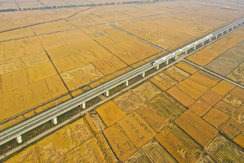 小田并大田 粮田变良田 "十四五"以来 又是一年收获时 从耕地平原 到高山梯田 良田舒卷 "十四五"以来 我国深入实施国家粮食安全战略 强化藏粮于地、藏粮于技 10月14日,在吉林省公主岭市,一列高铁列车沿着田间的铁路线穿行(无人机照片)。2025年,吉林省深化农机研发、制造、推广、应用 一体化试点示范,农作物耕种收综合机械化率达94.6%。新华社记者 张楠 摄 全方位夯实粮食安全根基 10月14日,在黑龙江省牡丹江市西安区沙虎村,村民在水稻田里忙碌(无人机照片)。新华社记者 张涛 摄 9月18日拍摄的重庆市黔江区五里镇梯田景色(无人机照片)。地处武陵山区腹地的重庆市黔江区五里镇水稻种植面积5300亩,是武陵山 地区粮食主要产区之一。新华社记者 唐奕 摄 我国累计建成超过10亿亩高标准农田 相当于黑龙江、河南两省面积的总和 7月9日拍摄的四川省攀枝花市米易县撒莲镇安全村高标准农田(无人机照片)。新华社记者 江宏景 摄 5月27日,在江苏省南通市通州区金沙街道高标准农田里,农民驾驶收割机抢收小麦(无人机照片)。新华社发(翟慧勇摄) 我国粮食产量迈上新台阶 2024年突破1.4万亿斤 比2020年增产740亿斤 ...