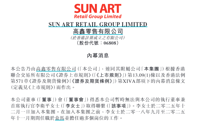 公司管理层变动 - 高鑫零售公告暂时无法与执行董事兼首席执行官李卫平取得联系 [1] - 董事会认为该事项对集团无重大不利影响 业务及营运维持正常 日常业务及管理由董事会主席华裕能暂时负责 [3] - 公司曾对市场传闻CEO被查进行辟谣 称“假的 在报警沟通了” [3] 公司背景与近期股权变更 - 李卫平于2025年12月1日加入高鑫零售 此前于2018年9月至2025年11月期间任职于盒马 [3] - 高鑫零售是拥有大卖场及多渠道电商业务的中国领先零售商 旗下品牌包括大润发、大润发Super、M会员店 [3] - 2017年至2024年 阿里巴巴集团是高鑫零售重要投资方之一 2025年1月 阿里系将大润发股权出售给德宏资本 [3] 公司经营现状 - 截至2025年9月30日 高鑫零售在全国29个省市自治区内205个城市共拥有462家大卖场、32家中型超市及7家会员店 总建筑面积约为1340万平方米 [3] - 大润发在河南省正常营业的门店仅剩个位数 在区域零售行业及消费市场的影响力已变得非常微弱 [4] 行业历史地位 - 大润发曾是国内第一大外资超市品牌 巅峰时期门店数量近千 与永辉并称中国超市双雄 [3]