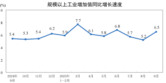 国家统计局:2025年9月份规模以上工业增加值增长6.5%