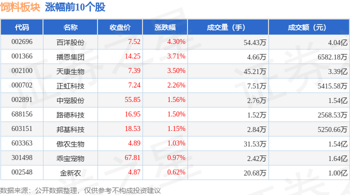 从资金流向上来看,当日饲料板块主力资金净流出6718.56万元,游资资金净流入2196.74万元,散户资金 净流入4521.81万元。饲料板块个股资金流向见下表: | 代码 | 名称 | 收盘价 | 涨跌幅 | 成交量(手) | 成交额(元) | | --- | --- | --- | --- | --- | --- | | 002311 | 海大集团 | 57.71 | -2.85% | 7.58万 | 4.44 | | 603668 | 天马科技 | 15.02 | -1.31% | 33.29万 | 5.05亿 | | 300673 | 佩蒂股份 | 17.96 | -1.21% | 5.43万 | 9847.34万 | | 001313 | 都是與國 | 7.62 | -0.91% | 12.34万 ﺎ | 9540.88万 | | 002385 | 大北农 | 4.06 | -0.49% | 118.76万 | 4.83亿 | | 002567 | 唐人神 | 4.70 | 0.00% | 25.69万 | 1.21亿 | | 603609 | 禾丰股份 | 7.56 | 0.13% | 3.80万 ...