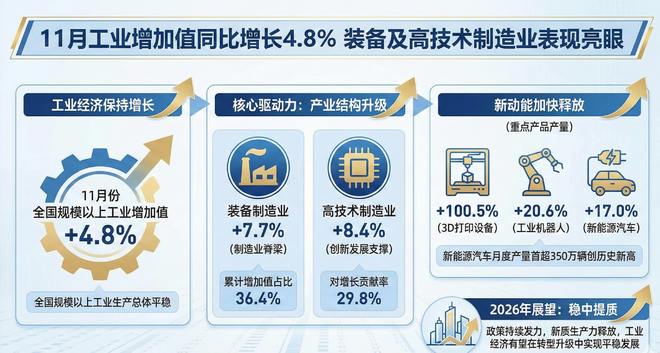 苏商银行特约研究员武泽伟在接受《中国经营报》记者采访时表示,上述数据表明,当前工业生产保持 了稳健增长的韧性。此次增长的核心驱动力来自产业结构持续升级,尤其是代表先进制造方向的装备制 造业和高技术制造业,其增速明显快于工业整体水平,显示出新质生产力发展的强劲势头。 装备制造业是制造业的脊梁,高技术制造业是创新发展的重要支撑。国家统计局数据显示,11月份,规 模以上装备制造业增加值同比增长7.7%,累计增加值占全部规模以上工业的比重达36.4%,较2024年全 年提高1.8个百分点,已连续33个月保持在30%以上。同时,规模以上高技术制造业增加值同比增长 8.4%,增速较10月份加快1.2个百分点,对全部规模以上工业增长的贡献率达29.8%。 北京市社会科学院副研究员王鹏在接受《中国经营报》记者采访时表示,11月份工业增加值同比增长, 是政策、外需与新动能协同发力的结果。 在王鹏看来,首先,政策引导产业升级。设备更新和消费品以旧换新政策拉动高技术制造业产能释放, 推动产业向高端化转型。其次,外需韧性形成托底。我国制造业全球竞争力较强,出口保持相对稳定, 为工业增长提供外部支撑。再次,新动能加快释放。3D打印、工 ...