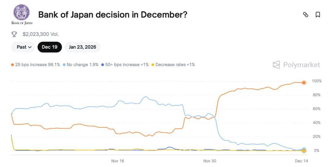 冰与火之歌 2025年的冬季,加密货币市场并未迎来预想中的"圣诞老人行情",反而笼罩在一片紧张与不确定的迷雾之中。比特币价格在90,000美元的心理关口附近徘 徊,多空双方激烈博弈,市场情绪如履薄冰。这股寒意的背后,并非源于加密世界内部的黑天鹅,而是来自全球两大经济体——美国与日本,截然相反的 货币政策路径所引发的一场完美风暴。 一边是美联储开启降息通道,释放流动性;另一边是日本央行(BOJ)磨刀霍霍,准备终结数十年的负利率时代。这"一松一紧"的宏观大戏,为何会让习 惯了风浪的币圈交易员们感到前所未有的紧张?答案隐藏在一个深刻影响全球资本流动的机制,以及比特币对全球流动性的高度敏感性之中。 在这双重压力下,理性的选择便是"平仓",即解除套利交易。投资者会开始抛售他们此前购买的风险资产(包括比特币),将所得资金换回日元以偿还债 务。如果这种平仓行为形成浪潮,将对全球市场造成巨大的卖压,形成一场"去杠杆化"风暴。 当前市场最直接的恐惧,源于日本央行即将在12月19日召开的政策会议。根据Polymarket等预测市场的数据,市场普遍认为日本央行此次加息25个基点的 概率高达98%,这将使其基准利率达到0.75%,进 ...
