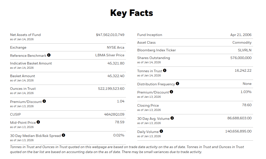 基金概况 - 基金名称为iShares Silver Trust 其资产类别为大宗商品 在纽约证券交易所Arca板块交易 参考基准为伦敦金银市场协会白银价格 基金成立日期为2006年4月21日 [2] - 截至2026年1月14日 基金净资产为475.62亿美元 已发行份额为5.76亿份 [2] - 基金不进行收益分配 [2] 持仓与估值 - 截至2026年1月14日 基金信托白银持有量为522,199,523.60盎司 相当于16,242.22吨 [2] - 截至2026年1月14日 指示性篮子金额为45,321.80 篮子金额为45,322.40 [2] - 截至2026年1月13日 基金收盘价为78.60 中点价为78.59 [2] - 截至2026年1月13日 基金溢价/折价率为1.03% 前一交易日溢价/折价为1.04 [2] 交易与流动性 - 截至2026年1月13日 基金30天中位数买卖价差为0.02% [2] - 截至2026年1月13日 基金30天平均成交量为86,688,603.00份 [2] - 截至2026年1月13日 基金日成交量为140,656,895.00份 [2]