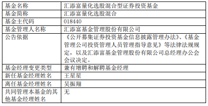 汇添富量化选股混合增聘王星星 吴振翔离任