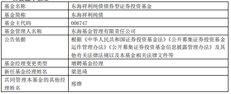 基金经理人事变动 - 东海基金公告增聘梁思琦为东海祥利纯债、东海锐安短债发起式、东海祥苏短债三只债券基金的基金经理[1] - 新任基金经理梁思琦拥有研究员、交易员及基金经理助理的复合背景,其职业路径为:长城国瑞证券资管研究员,2022年2月加入东海基金研发策略部任固收研究岗,2025年4月至12月于中央交易室任固收交易员,2025年12月调任资产配置部基金经理助理[1] - 此次变动为增聘,三只基金均采取共同管理模式,东海祥利纯债与邢炜共同管理,东海锐安短债发起式与张浩硕共同管理,东海祥苏短债与张浩硕、邢烨共同管理[3] 相关基金产品表现 - 东海祥利纯债成立于2018年12月28日,截至2026年02月02日,今年来收益率为0.27%,成立来收益率为18.67%,累计净值为1.1784元[1] - 东海锐安短债发起式A/C类成立于2025年06月09日,截至2026年02月02日,A类今年来收益率为0.14%,成立来收益率为1.05%,累计净值为1.0745元;C类今年来收益率为0.12%,成立来收益率为0.89%,累计净值为1.0089元[1] - 东海祥苏短债A/C类成立于2020年03月12日,截至2026年02月02日,A类今年来收益率为0.15%,成立来收益率为17.64%,累计净值为1.1764元;C类今年来收益率为0.13%,成立来收益率为16.21%,累计净值为1.1621元[2] - 东海祥苏短债E类成立于2022年04月11日,截至2026年02月02日,今年来收益率为0.14%,成立来收益率为11.23%,累计净值为1.1123元[2]