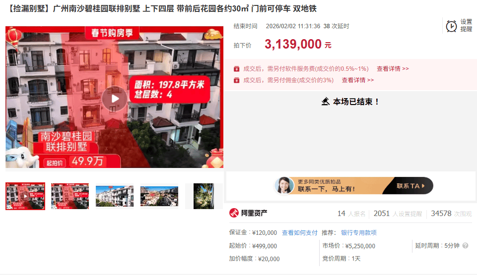 南沙碧桂园法拍别墅案例 - 一套位于广州南沙碧桂园漾月轩的联排别墅在阿里法拍平台成交 该房产建筑面积约197平方米 上下四层 前后带花园 临近地铁4号线金洲和飞沙角站 周边有万达广场、星河COCOPARK、港湾小学、执信中学及黄山鲁森林公园等配套 [1][5] - 该房产起拍价仅为49.9万元 经过48轮竞价后 最终以314万元成交 相比市场评估价525万元 相当于打了6折 [2][4] - 根据链家平台数据 目前南沙碧桂园别墅挂牌总价在350万至900万元之间 一套166平方米的三层别墅挂牌价356万元 单价约2.2万元/平方米 而本次法拍成交房产单价仅约1.6万元/平方米 存在明显价差 [11][14][16] - 该房产产权清晰无查封 可正常过户 但楼龄已24年(自2001年起) 内部装修过时且存在墙体掉皮、开裂等问题 竞得后预计需投入至少50万元进行装修 此外还需支付0.5-1%的服务费和3%的佣金 [16][18][21] 南沙区域其他法拍机会 - 南沙星河丹堤一套建筑面积约210平方米的半山豪宅将于2月5日开拍 起拍价63万元 该房产装修豪华并赠送品牌家电和车位 [25][26] - 目前链家平台上该小区别墅挂牌总价在560万至3900万元之间 最便宜房源单价约2.5万元/平方米 若以7折估算 最终成交价可能在360万元以上 仍具价格优势 [28][30] 南沙二手房市场整体状况 - 南沙区二手房挂牌量增长迅猛 广州中原研究院数据显示 其挂牌量从2024年的7655套增至2025年的9153套 涨幅高达19.4% 为全市最高 目前仅链家平台南沙挂牌量已突破1万套 [32][34] - 市场去化压力巨大 按当前月网签速度计算 消化现有挂牌房源需要整整2年时间 [37] - 南沙二手房成交周期长且成交量低 2024年平均成交周期超过211天 创近三年新高 2025年1月仅网签516套 为全市倒数第二 [38] - 市场下行压力导致价格大幅下跌 例如南沙奥园一套约150平方米房产 成交单价从2021年的1.8万元/平方米跌至当前的6812元/平方米 跌幅超过60% [40]