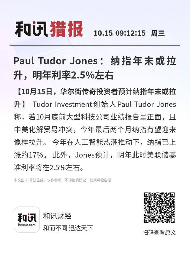 【10月15日,华尔街传奇投资者预计纳指年末或拉升】Tudor Investment创始人Paul Tudor Jones称,若 10月底前大型科技公司业绩报告呈正面,且中美化解贸易冲突,今年最后两个月纳指有望迎来像样拉 升。 今年在人工智能热潮推动下,纳指已上涨约17%。 此外,Jones预计,明年此时美联储基准利率将 在2.5%左右。 本文由 AI算法生成,仅作参考,不涉投资建议,使用风险自担 ...