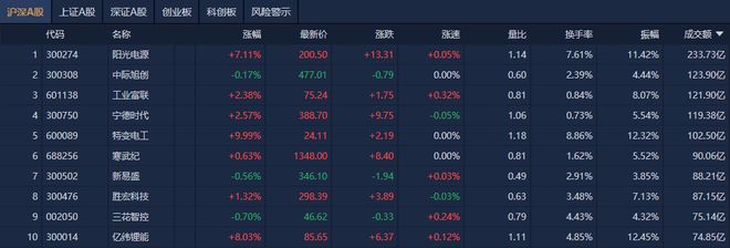 市场全天震荡反弹,三大指数低开高走,全线收红。南财金融终端显示,截至收盘,沪指涨0.23%,深 成指涨0.37%,创业板指涨1.03%。 盘面上,市场热点轮番活跃,全市场近3400只个股上涨。 从板块来看,电网设备板块持续爆发,京泉华3连板,摩恩电气、中能电气、神马电力2连板,特变电工 等近20股涨停; 下跌方面,量子科技概念股调整,科大国创、格尔软件走弱。 沪深两市成交额1.87万亿元,较上一个交易日缩量453亿。 个股方面,阳光电源成交额超233亿元居首,中际旭创、工业富联、宁德时代成交额靠前。 | 沪深A股 | 上证A股 | 深证A酸 | 创业板 | 科创板 风险警示 | | | | | | | | | --- | --- | --- | --- | --- | --- | --- | --- | --- | --- | --- | --- | | 4655 | | 名称 | | 深幅 | 震新价 | 淵跌 | 服速 | 是比 | 换手率 | 栏候 | 成交領▼ | | 1 300274 | | 阳光电源 | | +7.11% | 200,50 | +18,31 | +0.05% | 1.14 | 7. ...