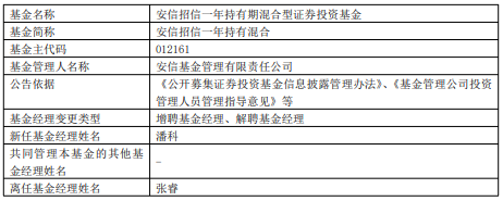 (责任编辑:康博) 中国经济网北京1月26日讯 近日,安信基金公告,安信招信一年持有混合、安信新成长混合增聘潘 科。 安信新成长混合A/C成立于2016年09月29日,截至2026年01月23日,其今年来收益率为1.68%、 1.67%,成立来收益率为63.61%、60.55%,累计净值为1.5455元、1.5214元。 | 基金名称 | 安信招信一年持有期混合型证券投资基金 | | --- | --- | | 基金同标 | 安信招信一年持有混合 | | 基金主代码 | 012161 | | 基金管理人名称 | 安信基金管理有限责任公司 | | 公告依据 | 《公开募集证券投资基金信息披露管理办法》、《基金管理公司投资 | | | 管理人员管理指导意见》等 | | 基金经理变更类型 | 增聘基金经理、解聘基金经理 | | 新任基金经理姓名 | 潘科 | | 共同管理本基金的其他基 | | | 金经理姓名 | | | 离任基金经理姓名 | 张睿 | | 基金名称 | 安信新成长灵活配置混合型证券投资基金 | | --- | --- | | 基金简称 | 安信新成长混合 | | 基金主代码 | 003345 | ...