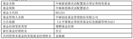 (责任编辑:康博) 中邮新思路灵活配置混合A/C成立于2015年11月11日和2025年01月14日,截至2026年01月23日,其 今年来收益率为5.44%、5.39%,成立来收益率为192.50%、23.54%,累计净值为2.9250元、2.9130元。 | 基金名称 | 中邮新思路灵活配置混合型证券投资基金 | | --- | --- | | 基金简称 | 中邮新思路灵活配置混合 | | 基金主代码 | 001224 | | 基金管理人名称 | 中邮创业基金管理股份有限公司 | | 公告依据 | 《公开募集证券投资基金信息披露管理办法》 | | 直令经抽变电家蓝 | 增聘基金经理 | | 新任基金经理姓名 | 宫正 | | 共同管理本基金的其他基金经理姓名 | 金振振 | 中国经济网北京1月26日讯 近日,中邮基金公告,中邮新思路灵活配置混合增聘宫正。 宫正曾任华夏基金管理有限公司机构投资组合经理、易方达基金管理有限公司帐户经理、长盛基金 管理有限公司研究员、华夏财富创新投资管理有限公司投资经理、中邮创业基金管理股份有限公司权益 投资部基金经理。 ...