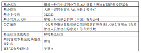 吴慧文离任大摩中证同业存单AAA指数7天持有