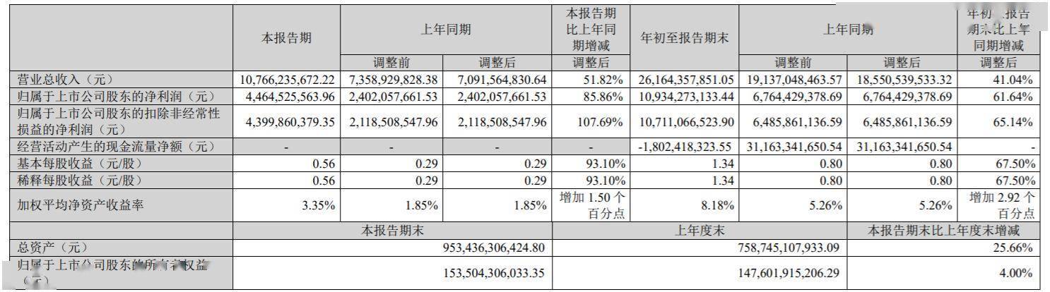 | | 本报告期 | | 上年同期 | 本报告期 比上年同 | 年初至报告期末 | | | --- | --- | --- | --- | --- | --- | --- | | | | | | 期增减 | | | | | | 调整前 | 调整后 | 调整后 | | | | 营业总收入(元) | 10.766.235.672.22 | 7.358.929.828.38 | 7.091.564.830.64 | 51.82% | 26.164.357.851.05 | 19.13 | | 归属于上市公司股东的净利润(元) | 4.464.525.563.96 | 2,402,057,661.53 | 2,402,057,661.53 | 85.86% | 10.934.273.133.44 | 6.76 | | 归属于上市公司股东的扣除非经常性 损益的净利润(元) | 4.399.860.379.35 | 2.118.508.547.96 | 2.118.508.547.96 | 107.69% | 10.711.066.523.90 | 6.48 | | 经营活动产生的现金流量净额(元) | | - | . ...
