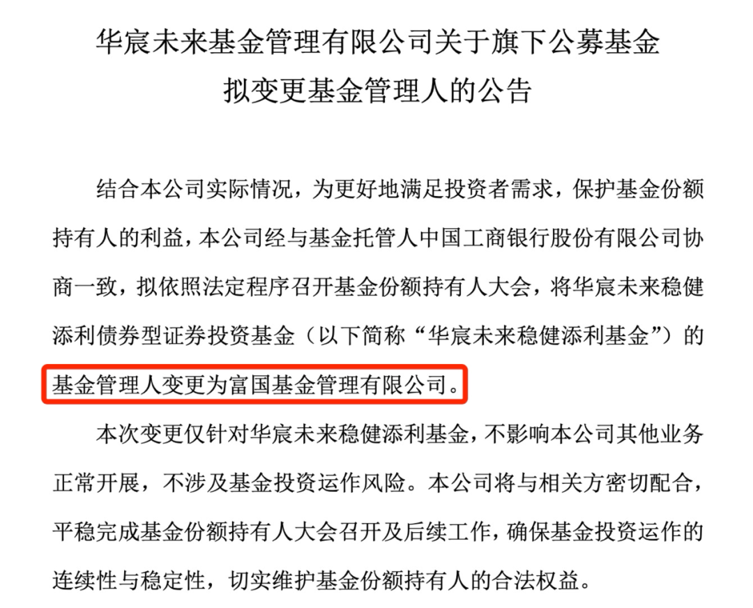 核心事件 - 华宸未来基金发布公告 拟召开基金份额持有人大会 将其旗下唯一的公募基金产品“华宸未来稳健添利债券”的基金管理人变更为富国基金 [1][2] - 若变更成功 华宸未来基金旗下将无存续的公募基金产品 成为“空壳”基金公司 [1] - 此次变更仅针对单只产品 不涉及公司股权等其他层面动作 不影响公司其他业务正常开展 [4][6] 事件背景与原因 - 华宸未来基金发展长期举步维艰 旗下公募基金规模仅在2023年四季度末及2024年一季度末短暂突破过10亿元 [9] - 公司经营状况堪忧 2024年营业收入为401.18万元 净亏损2001.14万元 2025年前三季度净亏损1140.35万元 所有者权益为-388.63万元 [9] - 公司管理费收入覆盖不了成本 且被审计机构出具了有保留意见的审计报告 [9] - 拟转让的“独苗基金”在2025年末出现净值异动 2025年11月27日至12月2日4个交易日内A类份额净值下跌7.41% 拖累全年单位净值下跌6.60% [4] - 该基金总规模从2025年三季度末的1.89亿元下降至0.43亿元 [4] - 此次基金管理人变更或是在地方监管局牵头下进行 旨在更好地保护投资者利益 [5] 公司股权与行业动态 - 华宸未来基金大股东华宸信托正拟“清仓”转让所持40%股权 在内蒙古股权交易中心挂牌价为480万元 相比首次挂牌价1720万元降价逾七成 [9] - 公募基金行业“马太效应”愈演愈烈 缺乏核心竞争力的小型资管机构可能面临被新股东接手、并购重组或自然退出的命运 [1] - 行业正在市场与监管双重作用下形成“优胜劣汰、进退有序”的生态 公募基金高质量发展行动方案明确提出支持基金公司市场化并购重组 推动严重违规机构依法出清 [1][9]
