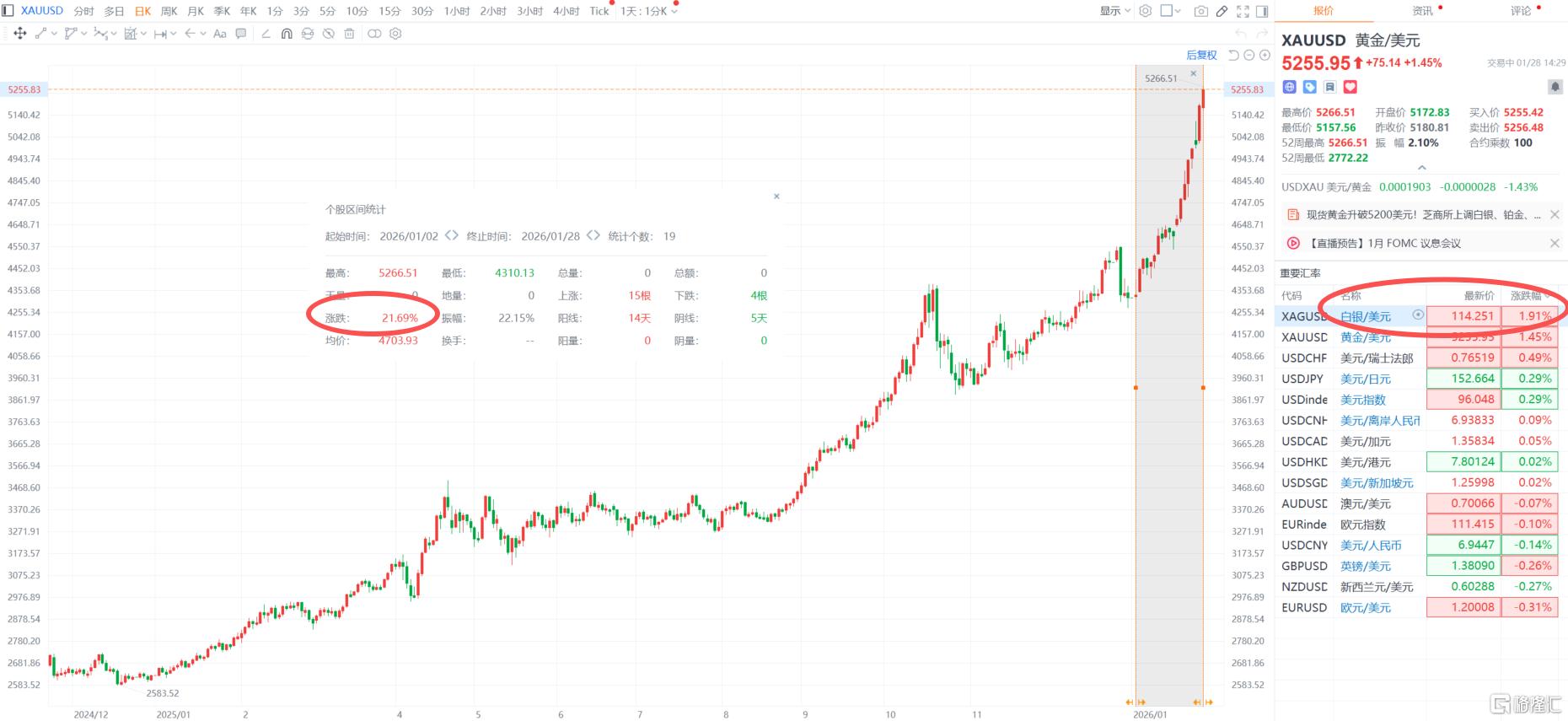 封面新闻记者 边雪 黄金市场,正在不断刷新人类对"硬通货"的认知。 1月28日,现货黄金价格延续近期强劲涨势,在早盘首次突破5200美元/盎司关口,截至发稿,金价仍持续攀升,最高报5233.93美元/盎司。 2026年1月以来,金价累计上涨已超过880美元,年内涨幅超20%。当被问及对当前历史性高位的黄金市场有何建议时,广东省黄金协会监事长兼首席分析 师朱志刚告诉封面新闻记者,当前黄金市场正处于"所有指标都可能失灵"的状态。"大家现在基本上都看涨了。"面对这样的市场情绪,他提醒投资者,虽 然长期看涨趋势明显,但短期暴涨同样伴随着暴跌风险。 黄金价格下一步还会涨吗?朱志刚透露:"年初的预测是突破5000美元/盎司,已经被突破了,下一个目标是6400美元/盎司。" 金价与金饰价格联动飙升 受金价强势带动,A股黄金概念股亦表现活跃。1月28日,中国黄金实现4连板,湖南黄金收获3连板,其他多家黄金公司股价均显著上涨。 对于尚未进入市场的投资者,"任何投资品都不是只涨不跌的,都会涨涨跌跌。"朱志刚建议以"储备资产"的心态购买黄金,"能买到就不要在乎它价高价 低",而不是以炒作心态进入市场。 对于同样表现强势的白银和铜, ...