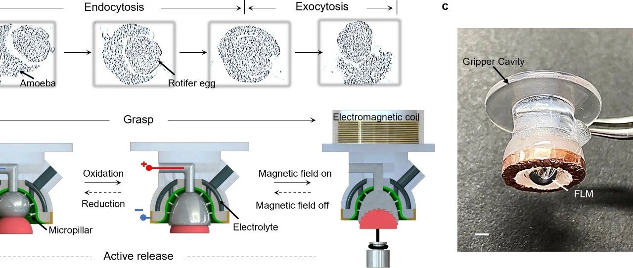 技术突破与核心性能 - 研发了一种基于功能液态金属的通用抓手(LiMU),其核心是一个3D打印的柔性硅胶腔体,内部填充功能性液态金属,并通过仿植物根系设计的6根微柱(单根提供0.34 N粘附力)将液态金属锚定在腔体内[4] - 实现了从皮克级(10⁻¹²克)到百克级(10²克)物体的稳定抓取与释放,操作跨度横跨14个数量级,覆盖微纳颗粒、生物细胞、电子元件到日常物品[8] - 在微纳尺度物体操控中,释放加速度高达42G,刷新了机器人释放速度的世界纪录,对于直径70微米、重0.05毫克的人类发丝,可在6毫秒内将其加速至696毫米/秒(约8700倍体长/秒)[3][6] - 操作接触压力最低可降至约10帕,为已有报道中的最低水平,远低于大多数脆弱生物组织的屈服极限[3][10] 工作机制与独特设计 - 揭示了基于表面张力调控的主动释放机制:通过电化学还原使液态金属恢复高表面张力,形变后的液态金属如同拉满的弓弩,在毫秒级时间内将包裹的微小物体“弹射”出去[6] - 设计了“环境无关的表面活性调控机构”,通过厚1毫米的电解质夹层和直径800微米的微通道构成的液体输送系统,使抓手在空气、海水、酸碱溶液等多种环境中均能稳定工作[4][12] - 通过电化学与磁场协同调控,实现了超柔顺抓取与主动释放[3] 应用场景与实验验证 - 成功无损抓取并释放了微型LED芯片(0.1 mg)、玻璃微纤维(0.58 μg)、二氧化硅微球(1.21 pg)等微纳物体[8] - 在生物样本操作中展现出优异性能:无损转运日本豆腐、金鱼幼苗、蒲公英花,并对200枚斑马鱼胚胎实现了99%成功率的高效操控,后续发育与对照组无显著差异[10] - 展现出极强的动态适应能力,可在200毫秒内捕获快速爬行的蟑螂,并能进行无视觉辅助的无序抓取任务[12] - 为生物样本操作、单细胞手术、微纳组装、深海探测等各类长期存在的操控挑战提供了全新的解决方案[15] 行业生态与相关企业(列举) - 工业/协作机器人企业:埃斯顿自动化、埃夫特机器人、节卡机器人、珞石机器人等[19] - 服务与特种机器人企业:亿嘉和、普渡机器人、施罗德机器人等[19] - 人形机器人企业:优必选科技、宇树、傅利叶智能、开普勒人形机器人等[20] - 具身智能企业:跨维智能、银河通用、科大讯飞、非夕科技等[21] - 医疗机器人企业:元化智能、天智航、精锋医疗、术锐机器人等[22] - 上游产业链企业:绿的谐波、因时机器人、坤维科技、凌云光等[23]