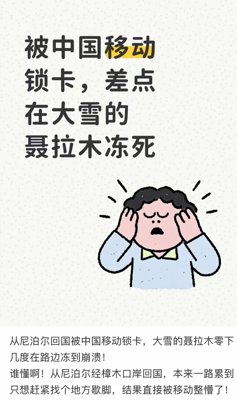 公司客户服务事件 - 中国移动客户在尼泊尔遭遇手机号被“保护性关停”,导致无法使用通信和支付功能,身处零下几度环境且无人民币现金陷入困境 [2] - 客户向客服求助,希望临时恢复数据连接4小时以解决食宿交通问题,但客服表示无法处理 [2] - 客服提供的解决方案包括前往就近营业厅实名验证、返回新疆办理或在光线较好处进行网上验证,但客户因夜晚太暗、当地营业厅停电关门而无法立即执行 [2] 公司风险控制措施 - 中国移动对客户手机号实施“保护性关停”的原因是为防止其被电信诈骗 [2] - 手机号被关停后,客户无法拨打电话和进行支付 [2]