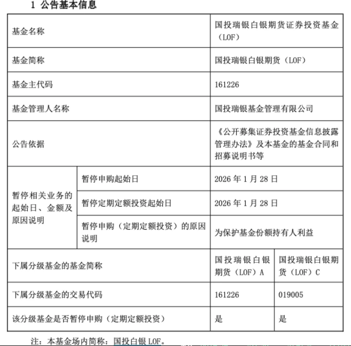 基金动态与风险控制 - 国投瑞银白银期货LOF自1月份以来已累计17次提示溢价风险 [1] - 截至1月26日收盘,该基金二级市场年内涨幅达46.13%,溢价率高达40.870% [1] - 为保护基金份额持有人利益,基金管理人宣布自1月28日起暂停该基金的申购及定期定额投资业务 [1][2] - 该基金A类份额上一次调整申购额度是在12月25日,当时是调整大额申购业务限制 [2] 贵金属市场表现 - 1月27日早间,伦敦金现日内涨幅超过1%,伦敦银日内涨幅扩大超过5% [3] - 1月26日,现货黄金价格突破5000美元/盎司关口,刷新历史新高 [3] - 1月26日,现货铂金价格盘中逼近3000美元/盎司关口,同样创下历史新高 [3] - 1月26日,现货白银价格触及117.738美元/盎司的历史新高 [3] 交易所监管动态 - 1月26日晚间,上海期货交易所发布通知,调整了白银、锡期货相关合约的交易限额 [3]