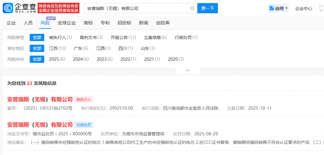 安普瑞斯(无锡)有限公司近期风险事件 - 公司新增一条被执行人信息,执行标的约299.25万元,执行法院为四川省成都市金堂县人民法院,立案日期为2025年10月11日 [1][2] - 公司因擅自销售未经强制性认证的电芯等违法行为,于2025年8月29日被无锡市市场监督管理局处以罚没款合计374.59万余元,其中包括没收违法所得约351.59万元和罚款23万元 [1][2] 罗马仕产品召回事件 - 罗马仕品牌方近期主动发起了移动电源召回计划,原因是其部分电芯原材料在极端场景下可能存在安全隐患,导致产品过热甚至燃烧的风险 [1][3] - 召回计划长期有效,涉及部分批次产品,品牌方为消费者提供换货或退款处理,并通过微信公众号等渠道加速处理流程 [3] 公司整体风险概况 - 根据公开信息,公司存在多项法律风险记录,包括1条被执行人信息、3条裁判文书、11条开庭公告、6条立案信息及1条行政处罚 [2] - 公司风险事件在2025年有6条记录,2024年有6条记录,2023年有6条记录,风险事件地域分布涉及江苏、广东、江西、四川、山东等多个省份 [2]