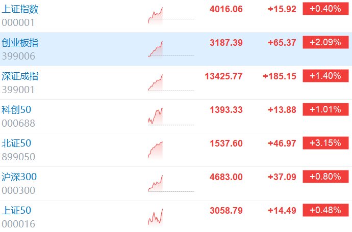 格隆汇11月13日|A股主要指数走强,创业板指拉升涨超2%,沪指涨0.4%,深成指涨1.4%。有色金 属、锂电产业链、存储芯片等方向涨幅居前。宁德时代涨超7%,成交额超100亿元。沪深京三市上涨个 股近3400只。 3分钟便捷开户,把握投资先机!长江证券三大尊享福利>> | 上证指数 | 4016.06 | +15.92 | +0.40% | | --- | --- | --- | --- | | 000001 | | | | | 创业板指 | 3187.39 | +65.37 | +2.09% | | 399006 | | | | | 深证成指 | 13425.77 | +185.15 | +1.40% | | 399001 | | | | | 科创20 | 1393.33 | +13.88 | +1.01% | | 000688 | | | | | 北证50 | 1537.60 | +46.97 | +3.15% | | 899050 | | | | | 沪深300 | 4683.00 | +37.09 | +0.80% | | 000300 | | | | | FJF50 | 3058.79 | +14 ...