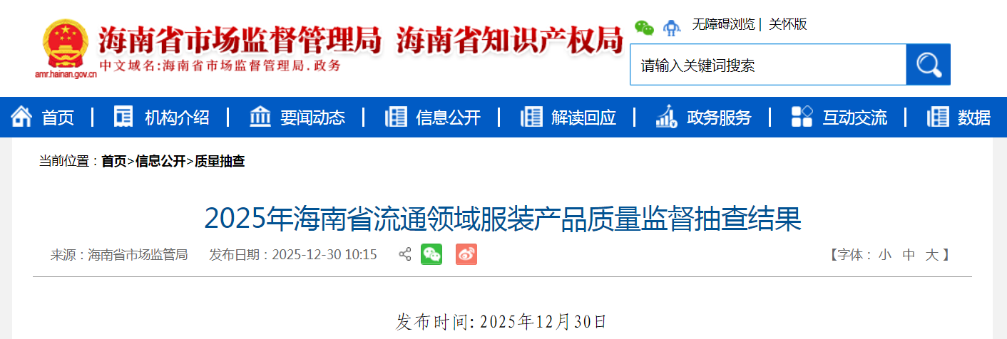 2025年海南省流通领域服装产品质量监督抽查结果公布