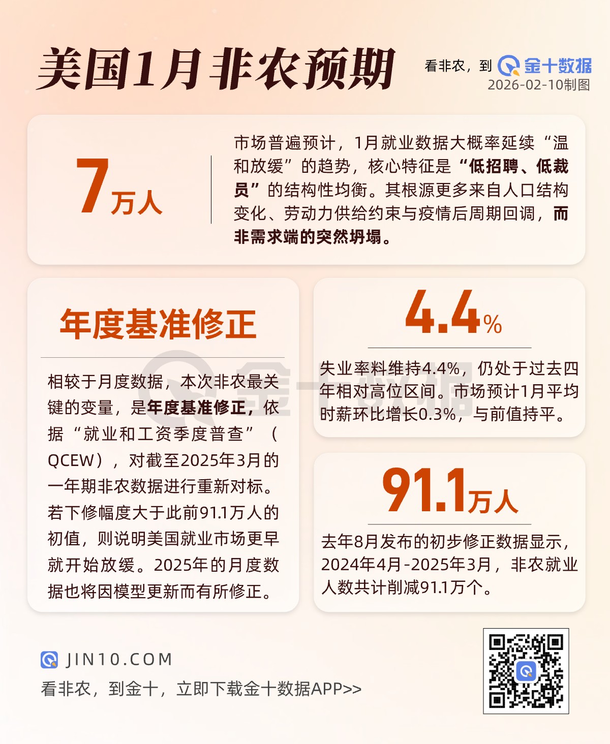 1月非农就业报告核心观点 - 报告因政府关门推迟发布,其重要性远超以往,核心在于年度基准修正可能系统性改写对美国劳动力市场的判断[1] - 报告预计不会在单月数据上制造巨大意外,但可能通过修正与方法更新重新勾勒美国劳动力市场的真实轮廓[9] - 就业增长放缓已是既定事实,根源更多来自人口结构变化、劳动力供给约束与疫情后周期回调,而非需求端突然坍塌[9] 常规月度就业数据趋势 - 市场普遍预计1月新增非农就业人口约7万人,略高于12月的5万人,失业率预计维持在4.4%[1] - 主要私营部门工资报告及“小非农”ADP数据显示,1月仅新增约22,000个私营就业岗位,远低于预期,强化了“就业温和放缓”的信号[6] - 1月平均时薪预计环比增长0.3%,与前值持平[8] 劳动力市场结构性特征 - 当前美国劳动力市场核心特征是“低招聘、低裁员”的结构性均衡,企业未大规模裁员,但新岗位创造速度明显放慢[6] - 劳动力市场指标显示,1月裁员激增至2009年以来最高水平,职位空缺降至多年低点,就业市场呈紧平衡甚至略偏弱状态[6] - 随着人口增长放缓及移民政策趋紧,新增劳动力规模已明显低于疫情前水平,月度新增就业人数难以回到此前动辄十几万、二十万的状态[6] 行业层面就业分化 - 建筑业因高度依赖移民劳动力,正面临供给约束[6] - 制造业、零售、休闲和酒店等周期性行业在2025年整体招聘乏力[6] - 医疗保健仍是少数保持扩张的领域,其动能是否持续将成为判断就业结构稳定性的关键[6] 年度基准修正及其影响 - 本次报告最关键的变量是年度基准修正,劳工统计局将依据“就业和工资季度普查”对截至2025年3月的一年期非农就业数据进行重新对标[7] - 初步估算显示修正可能高达下修91.1万人,创历史纪录,但一些分析认为最终修正值可能在72万左右[7] - 除总量修正外,劳工统计局还将同步调整去年全年的月度数据,并更新“出生—死亡模型”,模型调整旨在减少年度大幅修正,但短期内可能带来更高的月度波动性[7] 政策制定者解读与分歧 - 美联储内部对修正数据的潜在影响存在分歧,鲍威尔认为就业增长可能被高估但整体经济仍具韧性,而理事沃勒则认为修正后数据可能显示去年就业“几乎没有增长”[8] - 分歧背景是通胀尚未完全回落至2%目标,而就业已明显降温,薪资对通胀的推动作用正在减弱但尚未彻底消失[8] - 当前市场状态削弱了立即降息的紧迫性,也为未来政策调整保留了空间[9]