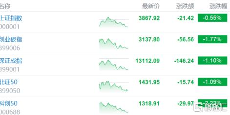 12月15日,A股三大指数今日集体走低。 截至收盘,沪指跌0.55%报3867.92点,深证成指跌1.1%,创业板指跌1.77%,科创50指数跌2.22%。 全市场成交额1.79万亿元,较前一交易日缩量3246亿元,超2900股下跌。 | 各称 | | 最新价 | 涨跌额 | 涨跌幅 | | --- | --- | --- | --- | --- | | 上证指数 | prim | 3867.92 | -21.42 | -0.55% | | 000001 | | | | | | 别业板指 90006 | my | 3137.80 | -56.56 | -1.77% | | 采证成指 | Myn | 13112.09 | -146.24 | -1.10% | | 399001 | | | | | | 比证50 | may | 1431.95 | -15.74 | -1.09% | | 399050 | | | | | | 12 20 | wm. | 1318.91 | | -29.97 -- 1 -- 1 | | 100629 | | | | | | 行业热力图 × -- | 领涨板块 | | | | | | ...