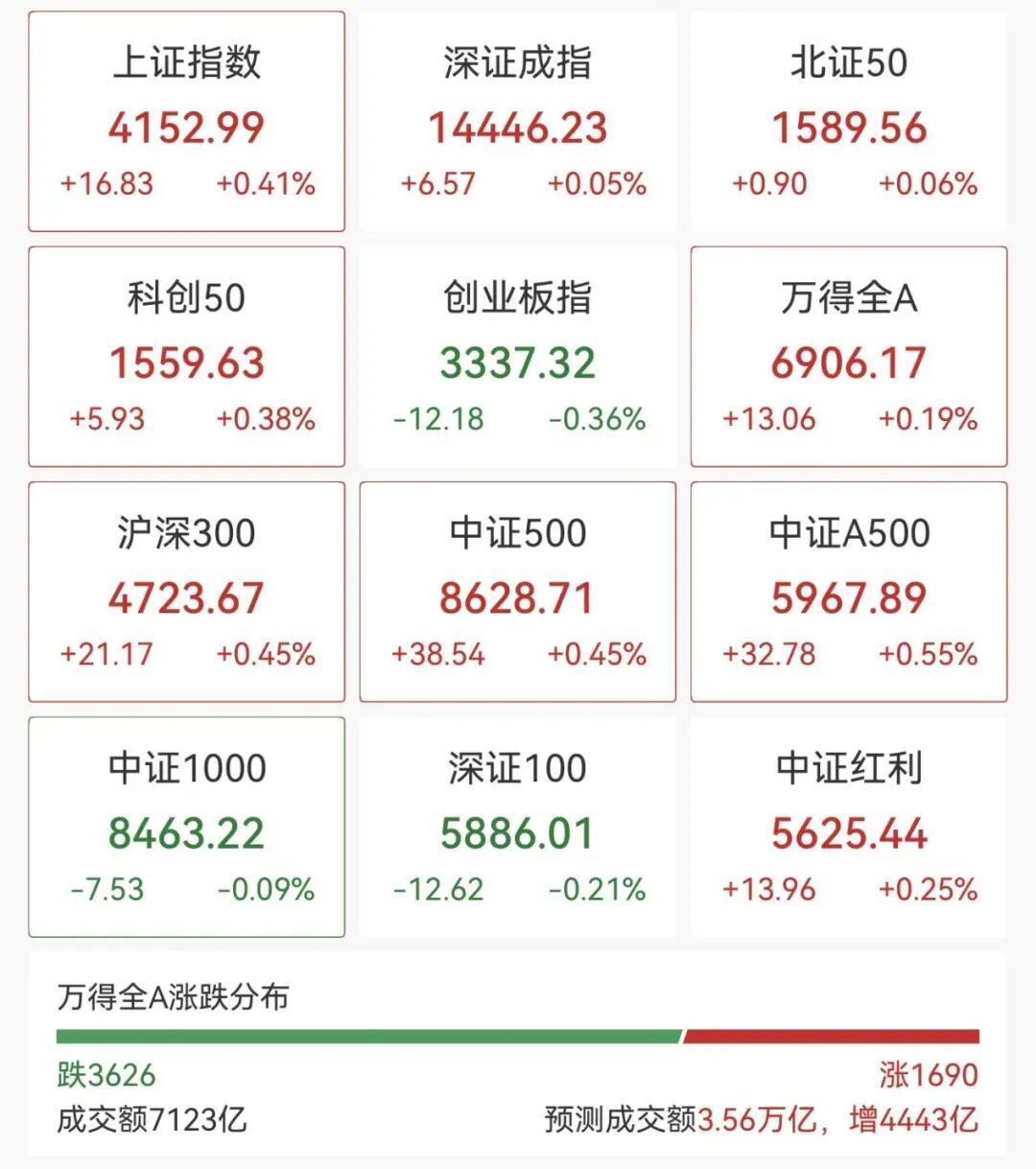 一起来看下最新的市场情况及资讯。 1月26日早盘,A股三大指数集体高开,随后震荡分化,截至发稿,沪指涨0.41%,深成指涨0.05%,创业板指跌0.36%。 | 上证指数 | 深证成指 | 北证50 | | | --- | --- | --- | --- | | 4152.99 | 14446.23 | 1589.56 | | | +16.83 +0.41% | +6.57 +0.05% | +0.90 +0.06% | | | 科创50 | 创业板指 | 万得全A | | | 1559.63 | 3337.32 | 6906.17 | | | +5.93 +0.38% | -12.18 -0.36% | +13.06 +0.19% | | | 沪深300 | 中证500 | 中证A500 | | | 4723.67 | 8628.71 | 5967.89 | | | +21.17 +0.45% | +38.54 +0.45% | +32.78 +0.55% | | | 中证1000 | 深证100 | 中证红利 | | | 8463.22 | 5886.01 | 5625.44 | | | -7.53 -0 ...