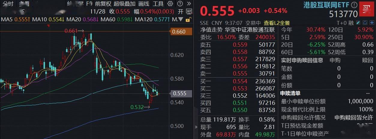 市场表现 - 港股早盘高开,恒生科技指数上涨0.15%,港股AI板块表现更强,港股互联网ETF(513770)场内价格现涨0.54%,站上5日和10日线 [1] - 科网龙头多数上涨,阿里巴巴-W涨超1%,美团-W、腾讯控股、快手-W跟涨,小米集团-W微涨0.3% [1] - 港股互联网ETF(513770)最新规模超百亿,年内日均成交额超6亿元,支持日内T+0交易,流动性佳 [5] 宏观环境 - 美联储12月降息25个基点的概率已高达86.9%,一周前该概率还不到30% [2] - 海内外市场聚焦美联储12月利率决议,降息预期大幅飙升 [2] 行业动态 - 国家新闻出版署公布2025年11月份国产网络游戏审批信息,共有178款游戏获批,版号数量创下近几年新高,哔哩哔哩旗下游戏在列 [3] - 游戏行业呈现出积极向好的发展态势 [3] 资金流向 - 南向资金大举增仓港股互联网龙头,阿里巴巴-W获南向资金连续11天净买入,累计净买入金额为254.49亿港元 [3] - 近1个月,小米集团-W获南向资金净买入136.19亿港元,美团-W、快手-W亦获净买入额居前 [3] - 具体净买入额:阿里巴巴-W 177.23亿港元,小米集团-W 136.19亿港元,美团-W 21.00亿港元,快手-W 12.41亿港元 [4] 指数与ETF构成 - 港股互联网ETF(513770)被动跟踪中证港股通互联网指数,该指数重仓互联网龙头 [5] - 前三大权重股:阿里巴巴-W权重18.89%,腾讯控股权重17.01%,小米集团-W权重10.05% [5][6] - 前十大持仓合计占比超73%,汇聚AI云计算、大模型及各领域AI应用公司 [5] - 香港大盘30ETF(520560)重仓股包括阿里巴巴、腾讯控股等科技股及建设银行、中国平安等高股息股 [6]