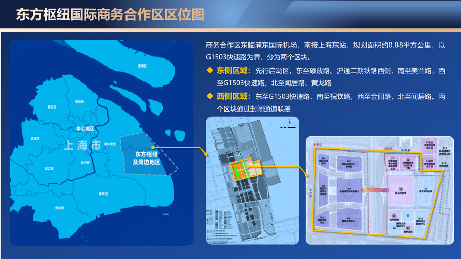 上海东方枢纽国际商务合作区于2024年2月经国务院批复设立,规划面积约0.88平方公里,以G1503快速路为界分为两个区 块,其中东侧区域为先行启动区,规划面积约0.44平方公里。 到2025年,完成商务合作区先行启动区封闭验收,商务合作区基本功能落地运行。到2028年,实现商务合作区全域封闭运 作,完成重点功能性基础设施建设。到2030年,全面建成商务合作区。 作为国际开放程度最高的区域之一,国际商务合作区以促进国际商务交流为目标,在综合保税区、海关监管区和口岸限定 区域管理制度基础上,叠加特定封闭区域人员跨境流动便利化政策措施和商务服务功能,把"一线放开、二线管住"的制度从货 物向自然人拓展,着力打造便利国际商务交流的新平台、服务资源要素汇聚的新载体、推动长三角一体化发展的新节点。 自国务院批复《上海东方枢纽国际商务合作区建设总体方案》以来,商务合作区积极推进制度、管理、基础设施等方面建 设,并取得阶段性成果。 11月28日,海关总署牵头的国家十部委对上海东方枢纽国际商务合作区先行启动区进行联合验收,并颁发验收合格证书。 这一全国首家全新特殊类型区域将为我国深入推进高水平改革开放注入新动能。 商务合作区积 ...