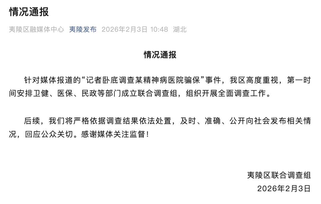 事件概述 - 媒体报道了记者卧底调查某精神病医院涉嫌骗保的事件 [1] - 事件发生地点为湖北省宜昌市夷陵区 [1] 政府应对措施 - 夷陵区政府高度重视,第一时间安排卫健、医保、民政等部门成立了联合调查组 [1] - 联合调查组已组织开展全面调查工作 [1] - 政府承诺将严格依据调查结果依法处置 [1] - 政府承诺将及时、准确、公开向社会发布相关情况,以回应公众关切 [1]