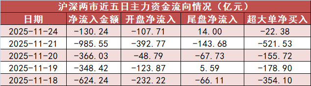 11月24日,A股市场整体小幅上涨。截至收盘,上证指数收报3836.77点,上涨0.05%,深证成指收报12585.08点,上涨0.37%,创业板指收报2929.04 点,上涨0.31%,北证50指数上涨0.63%。A股市场合计成交17405.74亿元,较上一交易日减少2433.32亿元。 1.A股市场全天主力资金净流出130.24亿元 今日A股市场主力资金开盘净流出107.71亿元,尾盘主力资金净流入14亿元,A股市场全天主力资金净流出130.24亿元。 | | | 沪深两市近五日主力资金流向情况(亿元) | | | | --- | --- | --- | --- | --- | | 日期 | | 人供快速 开盘免流入 | | 尾盘净流入 超大单净买入 | | 2025-11-24 | -130.24 | -107. 71 | 14. 00 | -22. 38 | | 2025-11-21 | -985. 55 | -392. 77 | -143. 68 | -521.53 | | 2025-11-20 | -366.03 | -48.79 | -67.73 | -155.72 | | 2025-11-19 ...