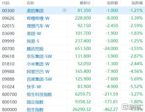 10月10日,港股三大指数回调,恒生科技指数跌3.27%,国企指数跌1.8%,恒生指数跌1.73%。 盘面上,作为市场风向标的大型科技股集体走低。半导体芯片股、锂电池股、黄金股等热门板块全线回落,其中,赣锋锂业跌10.75%,宁德时代跌超7%, 中芯国际、中国黄金国际跌幅明显。另一方面,餐饮等消费概念股逆势上涨,小菜园、奈雪的茶、百胜中国均走强,建筑材料板块继续上攻,中国天瑞水泥 领涨;煤炭股、燃气股、内房股、海运股、保险股多数表现活跃。 具体来看: 大型科技股多数下跌,百度跌5.69%,阿里巴巴4.56%,腾讯跌3.55%,京东、小米跌超2%,美团跌超1%。 | ન્દર્શ્ત | 名称 | | 最新价 | 张跌额 | 张跌幅 | | --- | --- | --- | --- | --- | --- | | 00300 | 美的集团 | 0 | 81.350 | -1.000 | -1.21% | | 09626 | 哔哩哔哩-W | | 228.000 | -8.000 | -3.39% | | 02015 | 理相汽车-W | | 92.150 | -2.450 | -2.59% | | 03690 ...