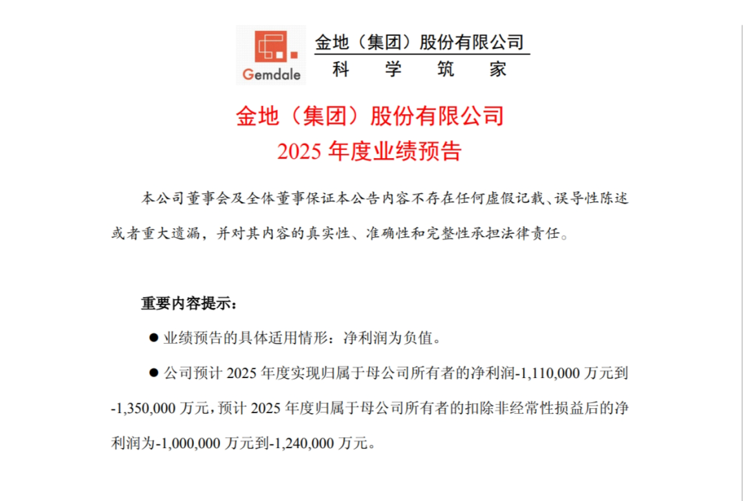 (来源:东方资色) 1月23日,金地集团发布2025年度业绩预告显示,预计2025年度净亏损111亿-135亿元;扣除非经常性损益的净亏损100亿-124亿元。 业绩预亏的主要原因,金地集团在公告中表示,公司近年销售规模下降,本年可结转面积较上年减少,营业收入较上年下滑。此外,公司根据市场情况动 态调整经营及销售策略,加大去化力度,使得部分项目存货可变现净值低于成本,基于谨慎性原则计提了存货跌价准备和信用损失准备。 新年第一天,金地集团还发布了一则人事变动公告。1月1日,公司发布公告称,董事会于近日收到董事季彤的书面辞职申请。季彤因工作变动的原因申请 辞去第十届董事会董事、副董事长、董事会战略委员会委员、审计委员会委员及薪酬与考核委员会委员等职务,辞职后不再担任公司任何职务。 (来源:东方资色) 1月23日,金地集团发布2025年度业绩预告显示,预计2025年度净亏损111亿-135亿元;扣除非经常性损益的净亏损100亿-124亿元。 业绩预亏的主要原因,金地集团在公告中表示,公司近年销售规模下降,本年可结转面积较上年减少,营业收入较上年下滑。此外,公司根据市场情况动 态调整经营及销售策略,加大去化力度,使得 ...