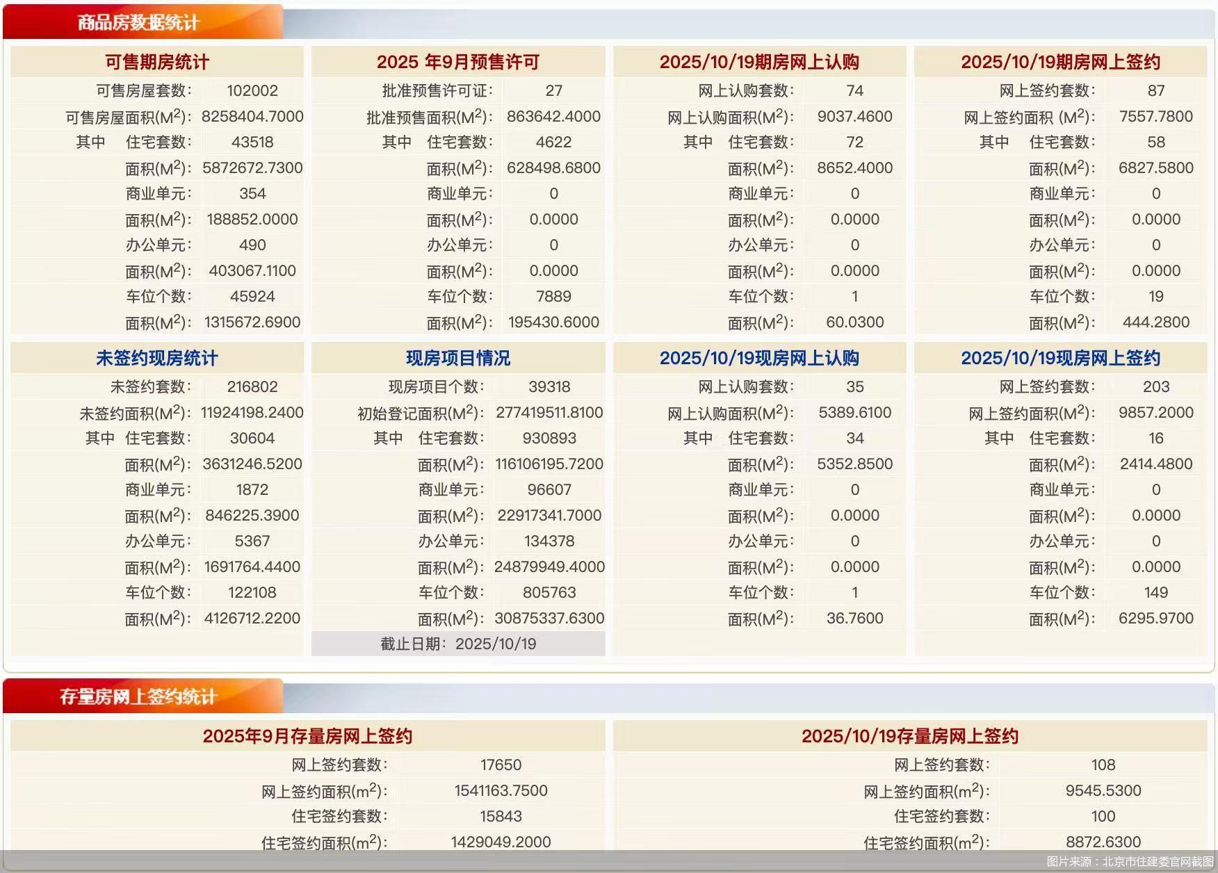 北京新房市场日度交易情况 - 10月19日北京新房总网签290套,网签面积17414.98平方米 [1] - 其中新房住宅网签74套,网签面积9242.06平方米 [1] 北京二手房市场日度交易情况 - 10月19日北京二手房总网签108套,网签面积9545.53平方米 [1] - 其中二手住宅网签100套,网签面积8872.63平方米 [1] 北京新房市场月度交易情况 - 2025年9月存量房网上签约套数为17650套,签约面积1541163.75平方米 [3] - 其中9月存量住宅签约15843套,签约面积1429049.2平方米 [3] 北京可售期房库存情况 - 截至2025年10月19日,可售期房套数为102002套,可售面积8258404.7平方米 [2] - 其中可售住宅套数为43518套,可售面积5872672.73平方米 [2] - 2025年9月批准预售许可证27个,批准预售面积863642.4平方米 [2] - 其中9月批准住宅预售套数4622套,批准住宅预售面积628498.68平方米 [2] 北京未签约现房库存情况 - 截至2025年10月19日,未签约现房套数为216802套,未签约面积11924198.24平方米 [2] - 其中未签约住宅套数为30604套,未签约面积3631246.52平方米 [2] - 现房项目个数为39318个,初始登记总面积277419511.81平方米 [2] - 其中现房住宅套数为930893套,初始登记面积116106195.72平方米 [2]