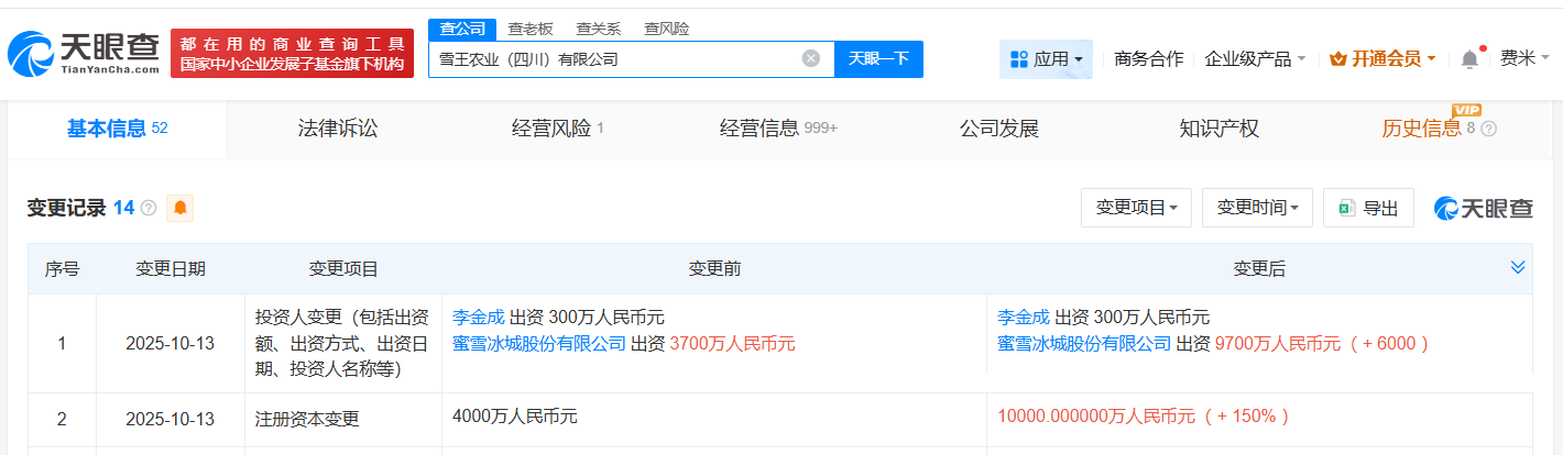 蜜雪冰城旗下四川雪王农业公司增资至1亿元