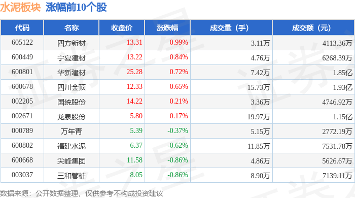 市场表现 - 2025年1月20日,水泥板块整体表现强劲,较上一交易日上涨3.3%,显著跑赢大盘,当日上证指数下跌0.01%,深证成指下跌0.97% [1] - 板块内个股普涨,领涨股为韩建河山,收盘价6.23元,单日涨幅达10.07% [1] - 海螺水泥作为行业龙头,当日涨幅为5.74%,收盘价23.59元,成交额高达26.23亿元,显示出较高的市场关注度与活跃度 [1] - 西藏天路、塔牌集团、青松建化、天山股份等个股涨幅均超过2.9% [1] - 板块内仅少数个股下跌,其中烘脂屋與跌幅最大,为-3.17%,四川金顶下跌-2.93% [2] 资金流向 - 当日水泥板块整体获得主力资金净流入,净流入金额为4.12亿元 [2] - 游资与散户资金则呈现净流出状态,净流出额分别为1.14亿元和2.98亿元 [2] - 海螺水泥获得主力资金净流入2.15亿元,主力净占比达8.21%,是板块内吸金能力最强的个股 [3] - 西藏天路主力资金净流入1.91亿元,主力净占比高达12.07% [3] - 韩建河山在股价领涨的同时,也获得主力资金净流入8993.26万元,主力净占比高达42.94%,但游资与散户资金均大幅净流出 [3] - 青松建化、塔牌集团、三和管桩、天山股份等个股也均获得超1000万元的主力资金净流入 [3]