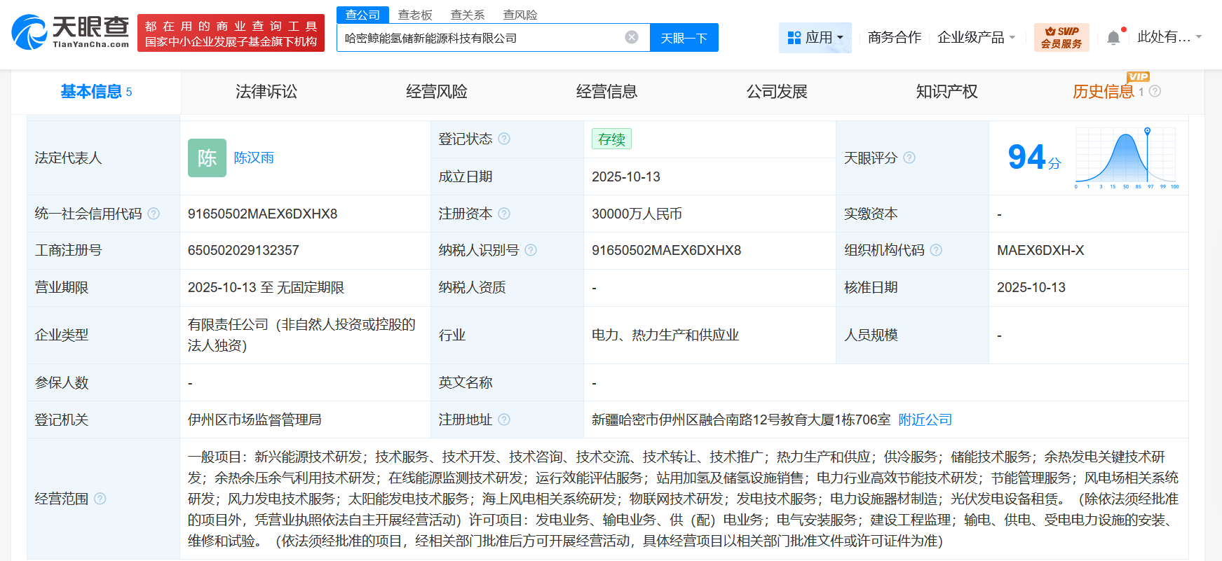 | 基本信息 5 | 法律诉讼 | 经营风险 | 经营信息 | 公司 | | --- | --- | --- | --- | --- | | 法定代表人 | 存续 医 陈汉雨 | 登记状态 ② | | | | | 2025-10-13 | 成立日期 | | | | 统一社会信用代码 ② | 91650502MAEX6DXHX8 30000万人民币 | 注册资本 ② | | | | 工商注册号 | 650502029132357 | 纳税人识别号 2 | 91650502MAEX6DXHX8 | | | 营业期限 | 2025-10-13 至 无固定期限 | 纳税人资质 | | | | 企业类型 | 有限责任公司(非自然人投资或控股的 法人独资) | 行业 | 电力、热力生产和供应业 | | | 参保人数 | | 英文名称 | | | | 登记机关 | 伊州区市场监督管理局 | 注册地址 ② | 新疆哈密市伊州区融合南路12 | | | 经营范围 ① | 一般项目:新兴能源技术研发;技术服务、技术开发、技术咨询、技术交流、技术转让、技术推广; 发;余热会压余气利用技术研发;在线能源监测技术研发;运行效能评估服务 ...