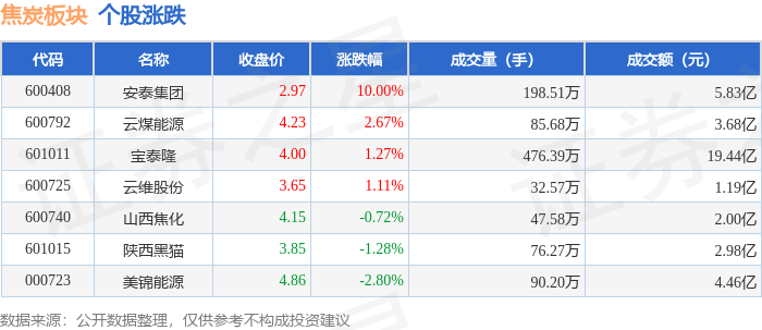 板块整体表现 - 焦炭板块在10月17日整体下跌0.44%,表现弱于大盘[1] - 当日上证指数下跌1.95%至3839.76点,深证成指下跌3.04%至12688.94点[1] - 板块主力资金净流出3.39亿元,但游资和散户资金分别净流入9838.27万元和2.41亿元[1] 个股价格变动 - 安泰集团领涨板块,股价上涨10.00%至2.97元,成交量为198.51万手[1] - 云煤能源股价上涨2.67%至4.23元,宝泰隆股价上涨1.27%至4.00元[1] - 美锦能源领跌板块,股价下跌2.80%至4.86元,成交额为4.46亿元[1] - 陕西黑猫股价下跌1.28%至3.85元,山西焦化股价下跌0.72%至4.15元[1] 个股成交情况 - 宝泰隆成交量最高,达476.39万手,成交额为19.44亿元[1] - 云维股份成交量最低,为32.57万手,成交额为1.19亿元[1] - 山西焦化成交量为47.58万手,成交额为2.00亿元,陕西黑猫成交量为76.27万手,成交额为2.98亿元[1]