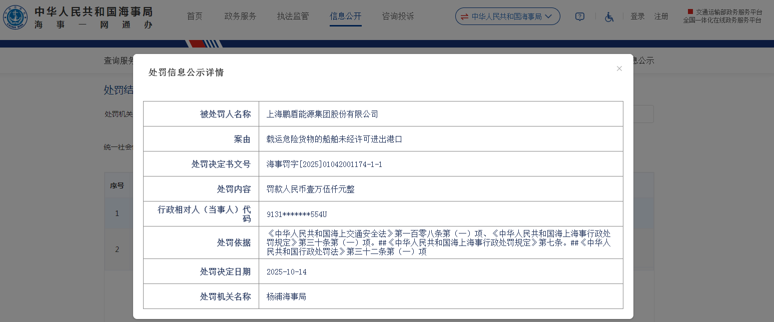 内容显示,该罚单案由是:载运危险货物的船舶未经许可进出港口。杨浦海事局依据《中华人民共和国海上交通安全法》第一百零八条第(一)项、《中华 人民共和国海上海事行政处罚规定》第三十条第(一)项、《中华人民共和国海上海事行政处罚规定》第七条、《中华人民共和国行政处罚法》第三十二条 第(一)项,对上海鹏盾能源罚款人民币壹万伍仟元整。 | 中华人民共和国海事局 日常 | 8 通 办 | 首页 政务服务 | 执法监管 | 信息公开 | 咨询投诉 | 一中华人民共和国海事局 | | --- | --- | --- | --- | --- | --- | --- | | | | 11111 | | | | | | 查询服务 | | 处罚信息公示详情 | | | | | | 外罚结 | | | | | | | | 处罚机关 | | 被处罚人名称 | 上海鹏盾能源集团股份有限公司 | | | | | 统一社会 | | 案由 | | | 不按照规定监测、监控,如实记载和保存船舶污染物、压载水和沉积物的排放及驶 | | | | | 处罚决定书文号 | 海事罚字[2025]01042001172-1-1 | | | | | 扇号 | ...