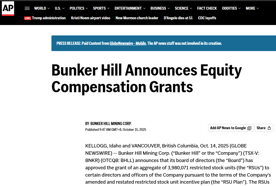 股权激励计划详情 - 董事会批准向公司董事及高级管理层授予总计3,980,071份受限股票单位(RSUs)和626,593份股票期权 [1] - 受限股票单位以名义价格每股0.215加元分三阶段解锁,解锁时间点分别为2025年10月14日、2026年6月30日及2027年6月30日 [1][3] - 股票期权行权价同样为每股0.215加元,有效期至2030年10月14日,并将在未来三年内逐步解锁 [1][3] 激励计划战略目的 - 激励计划旨在激励核心团队,全力支持公司重启并开发其位于北美的旗舰矿产资产 [1] - 公司将管理层、董事和股东的利益紧密地联系在一起,确保全力以赴实现伯克希尔矿山重启和开发的关键目标 [3] - 计划正值公司计划以爱达荷州的伯克希尔矿山为起点,整合并优化其在北美的一系列矿产资产 [3] 项目实施背景 - 公司计划重启并开发其位于北美的旗舰矿产资产 [1] - 通过股权激励确保核心团队在项目关键的启动和开发阶段保持稳定和专注 [3] - 项目涉及以爱达荷州的伯克希尔矿山为起点,整合并优化在北美的一系列矿产资产 [3]